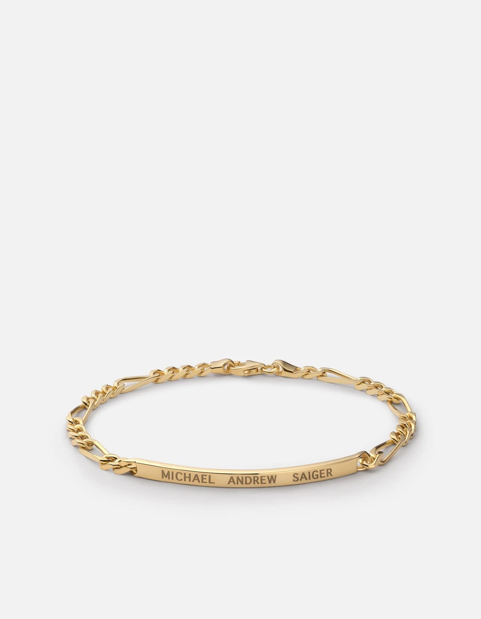 We’ve updated the 3mm Figaro Chain Bracelet to include our sleek name plate, which features a gently curving modern design. The gold vermeil bracelet has Italian-influenced flat-lay links that are thoughtfully assembled for a streamlined chain design. Note to self: Add this to the everyday wardrobe. Customizable with up to 21 characters. Available for women and men.