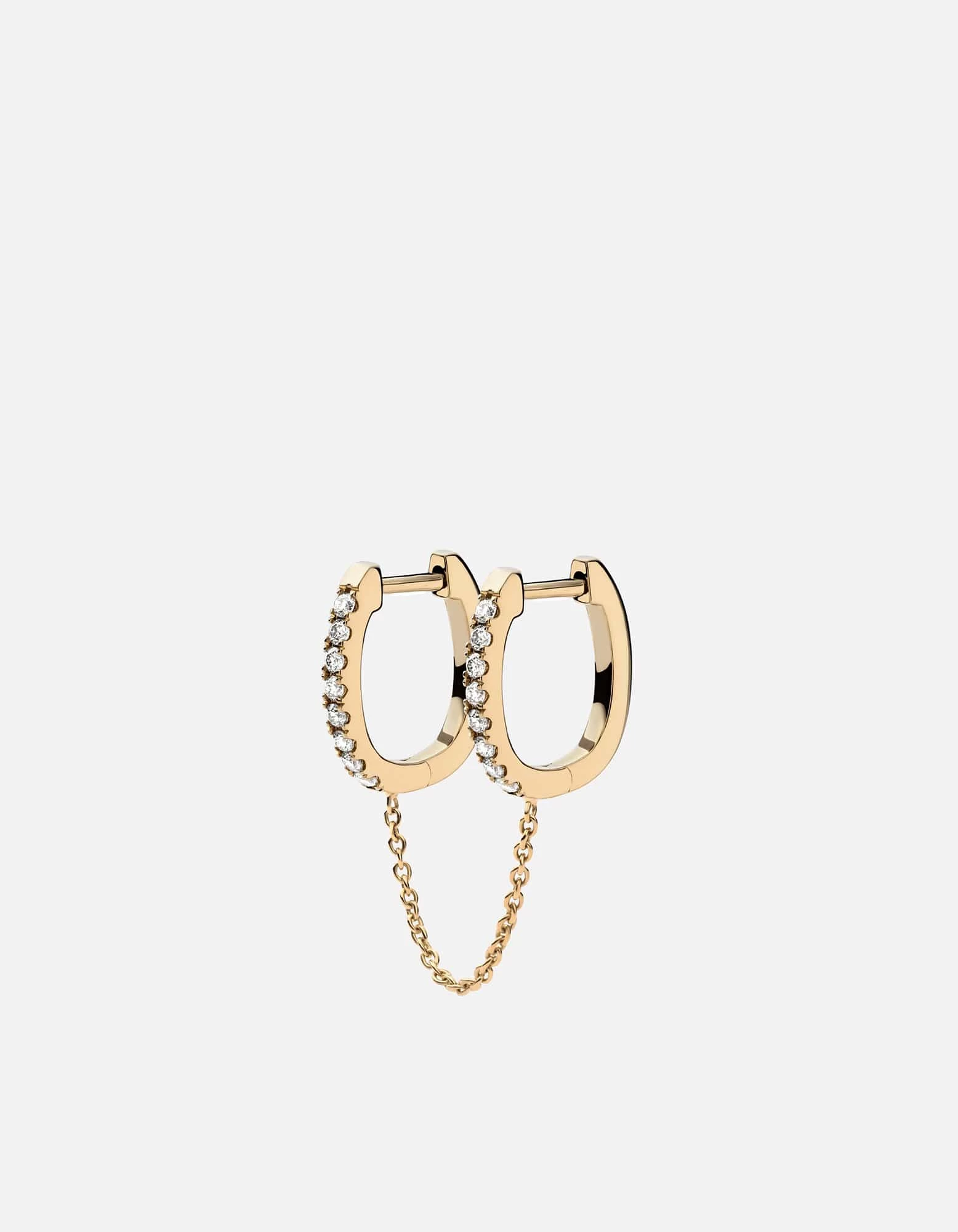 The women’s Avery Huggie Earring is encrusted in conflict free ethically sourced pave diamonds and features a refined chain that connects a pair of 14k yellow gold hoops that climb your ear. Add some edge to your everyday look.