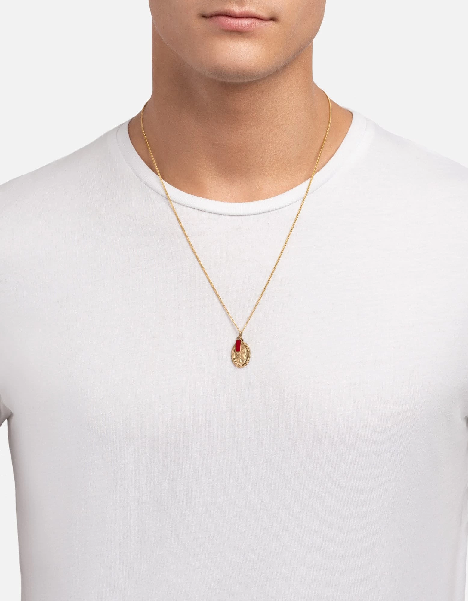 Embrace a dual perspective with the men’s Entrata Pendant Necklace. Inspired by Janus, the Roman god of doors and transitions, this pendant encourages the wearer to find a middle ground between the past and future. Made in 14k gold vermeil and red enamel, the pendant hangs from a 24-inch chain.