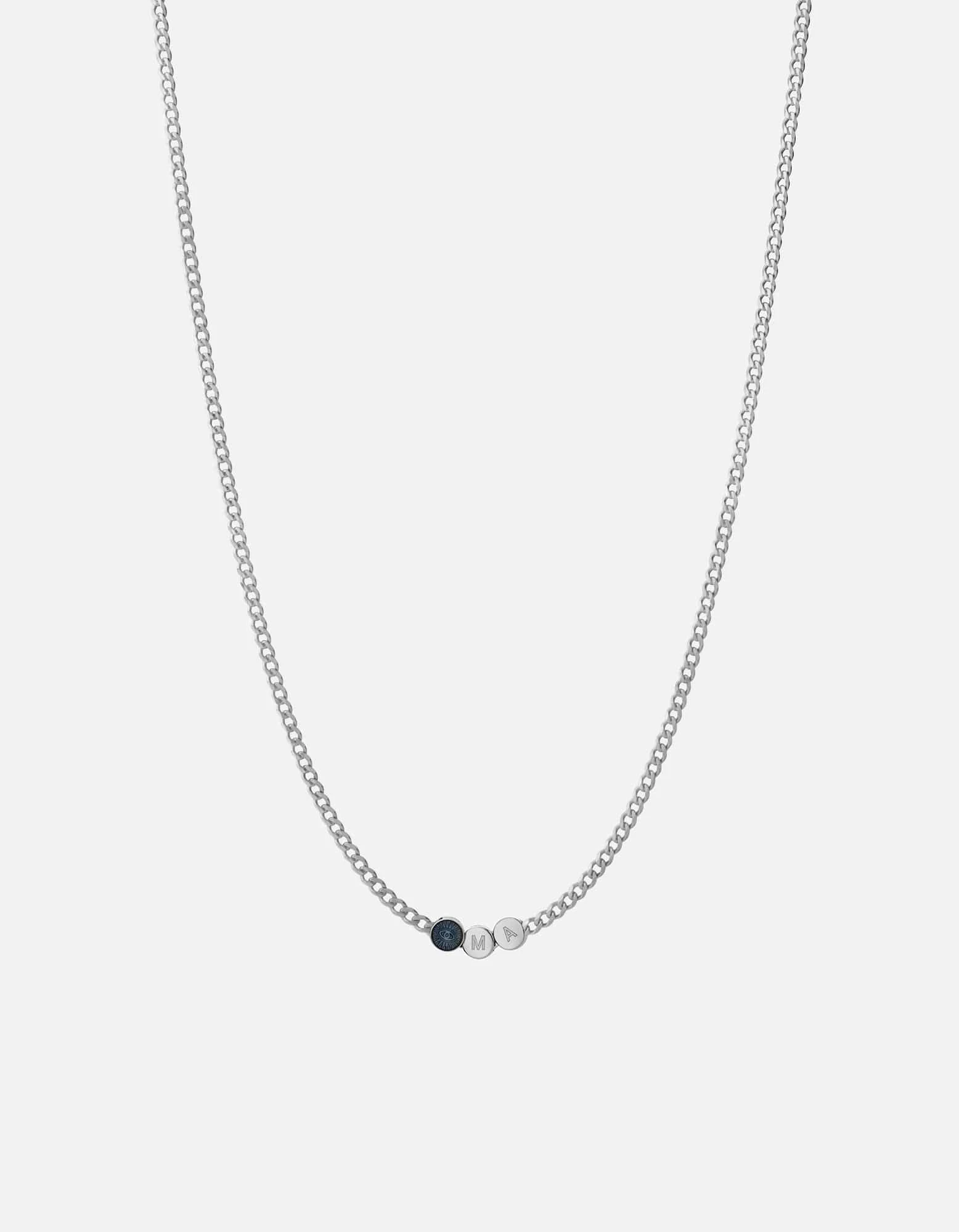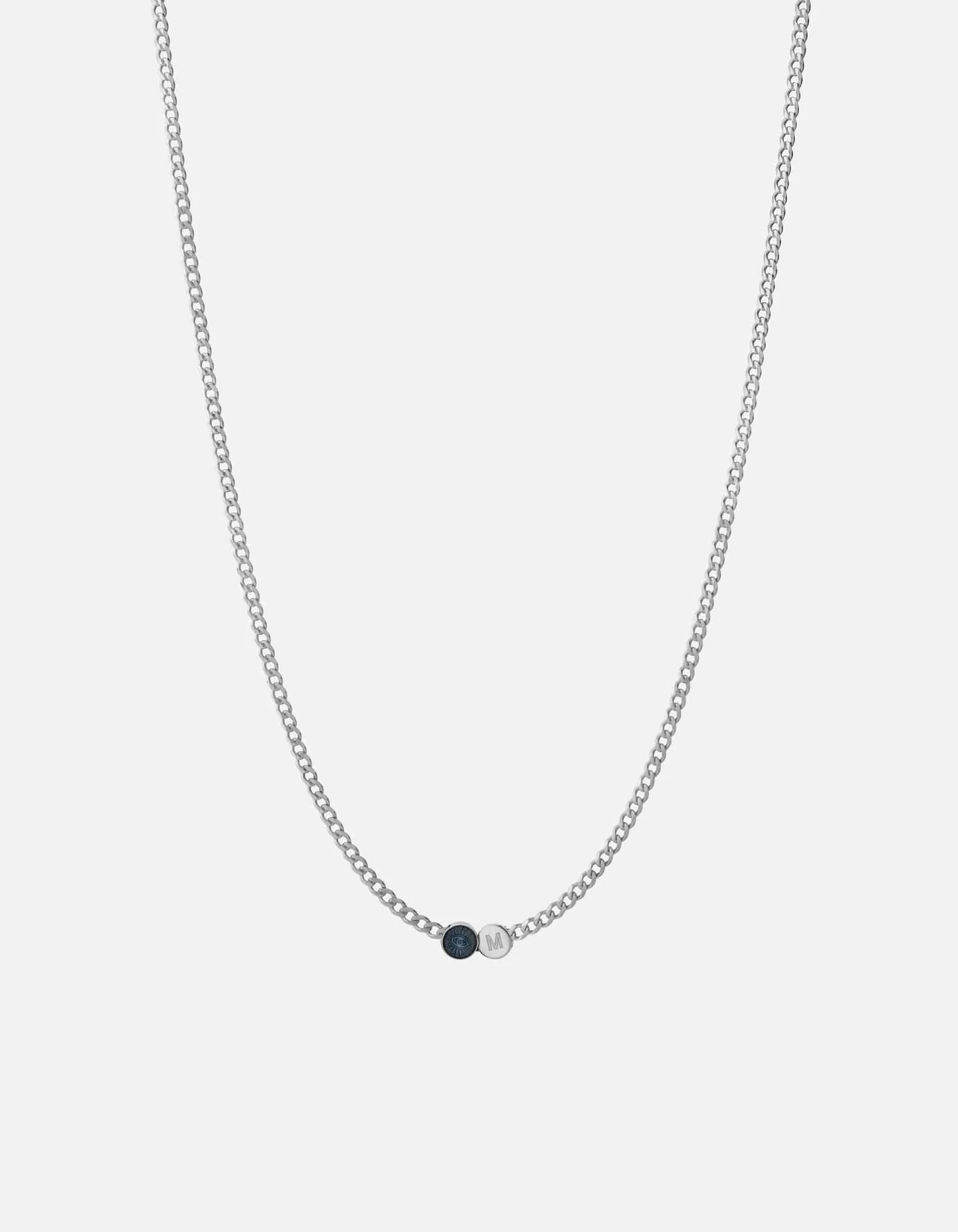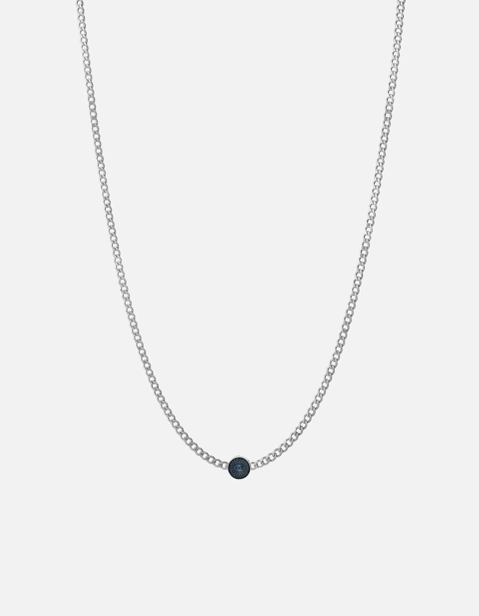 The Eye of Time Type Chain Necklace features a thoughtful nod to the Ancient Eye of Protection, said to ward off negative energy. Made in sterling silver and with blue enamel, this men’s necklace is the positive energy you’ve been seeking.