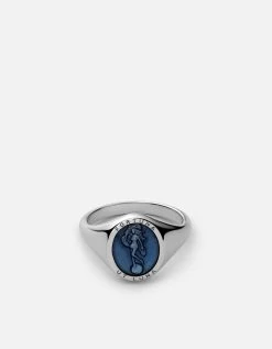 This adaptation of a French antique religious symbol features the Goddess of Fortune and Luck, with the Latin phrase “Fortuna Ut Luna” etched on the perimeter, serving as reminders to embrace one’s uniqueness so that prosperity will come. Made with sterling silver and blue enamel.