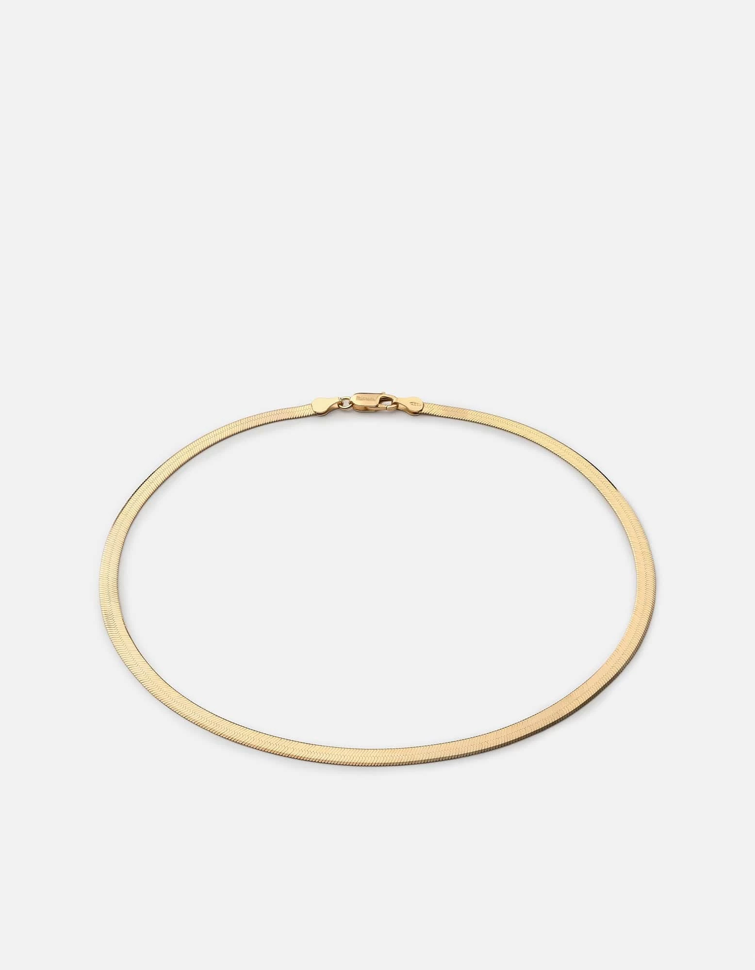 We resurrected the minimal retro style famed in the ’80s with the Herringbone Choker. This women’s necklace is cool enough to wear alone yet simple enough to layer with others. Made with a 15-inch gold vermeil flattened chain.