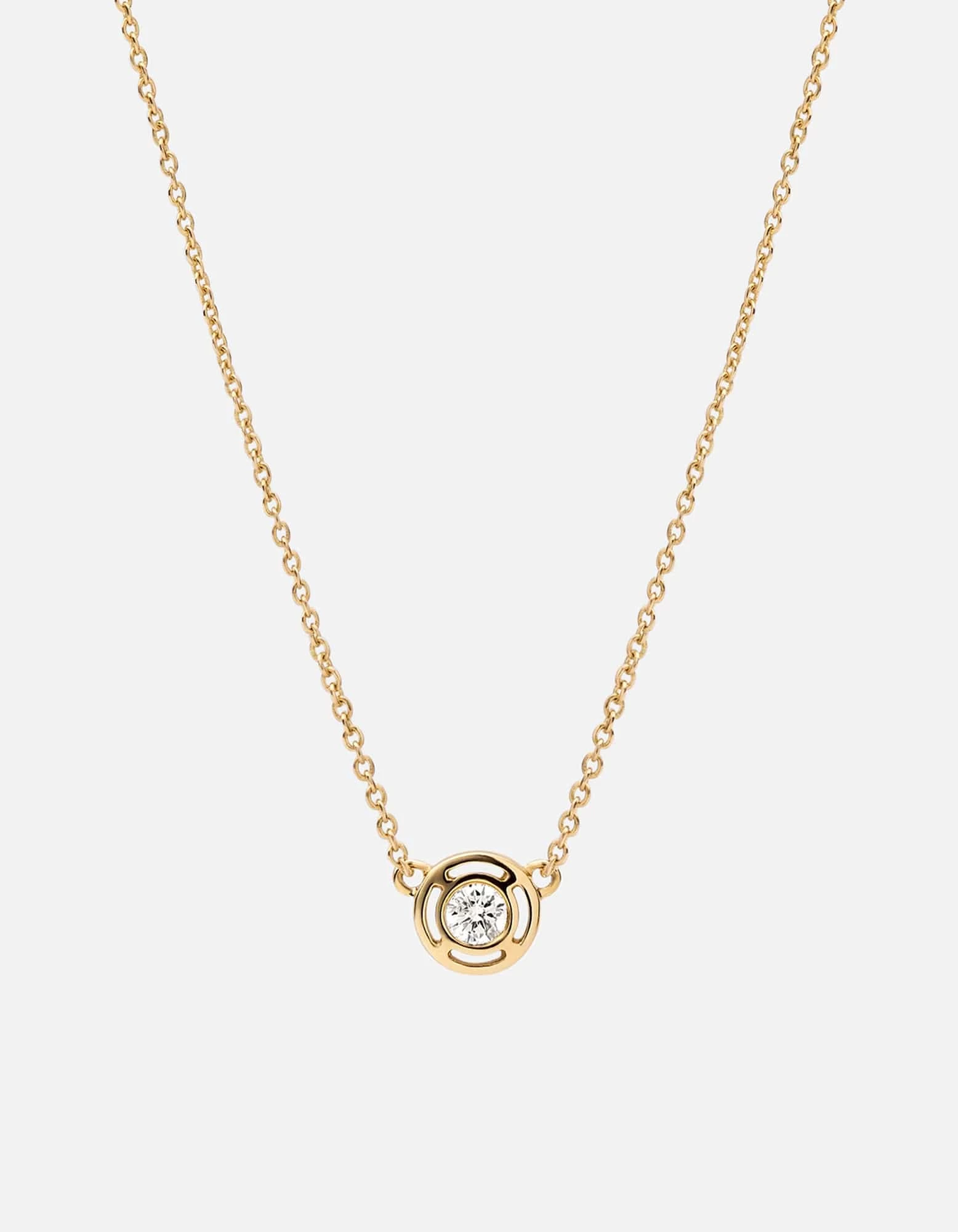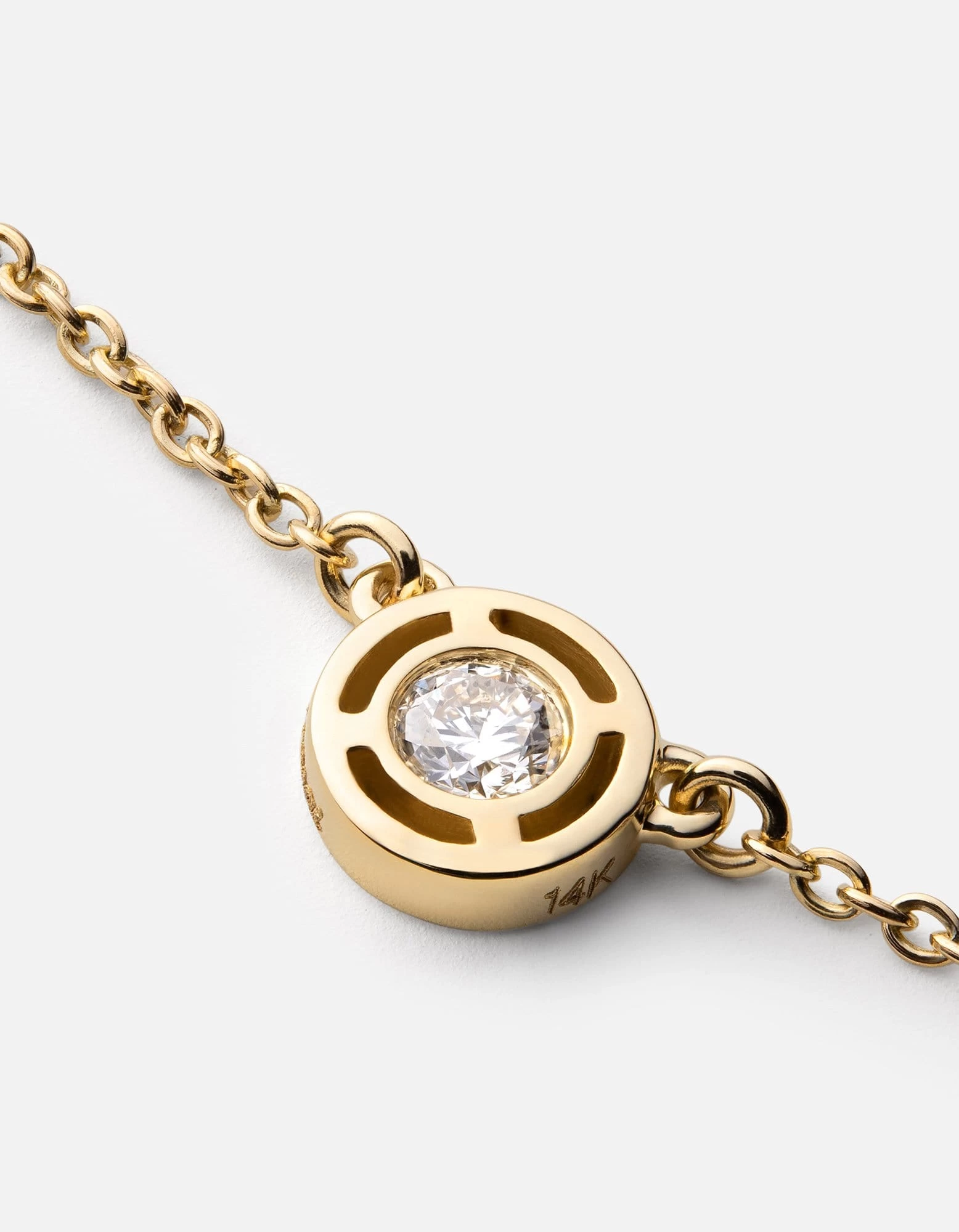 The Luna Necklace offers a subtle aire of luxury with a solitaire diamond bezel set in 14k yellow gold, hanging on an adjustable 16-inch chain.
