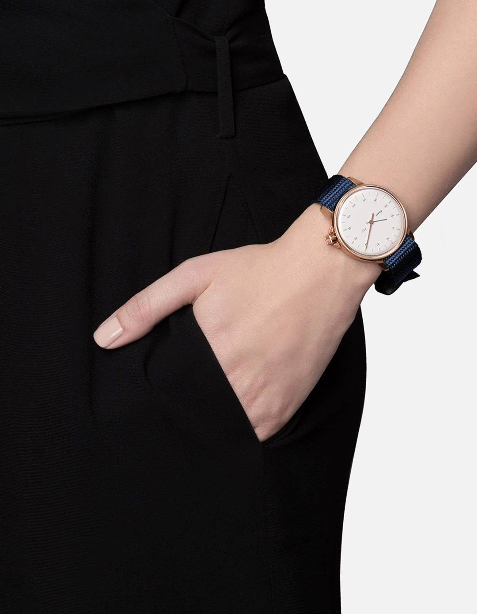 A clever and innovative blend of quality and style, this M12 watch is Swiss-made with quartz movement and nylon strap, custom made from rock climbing webbing.