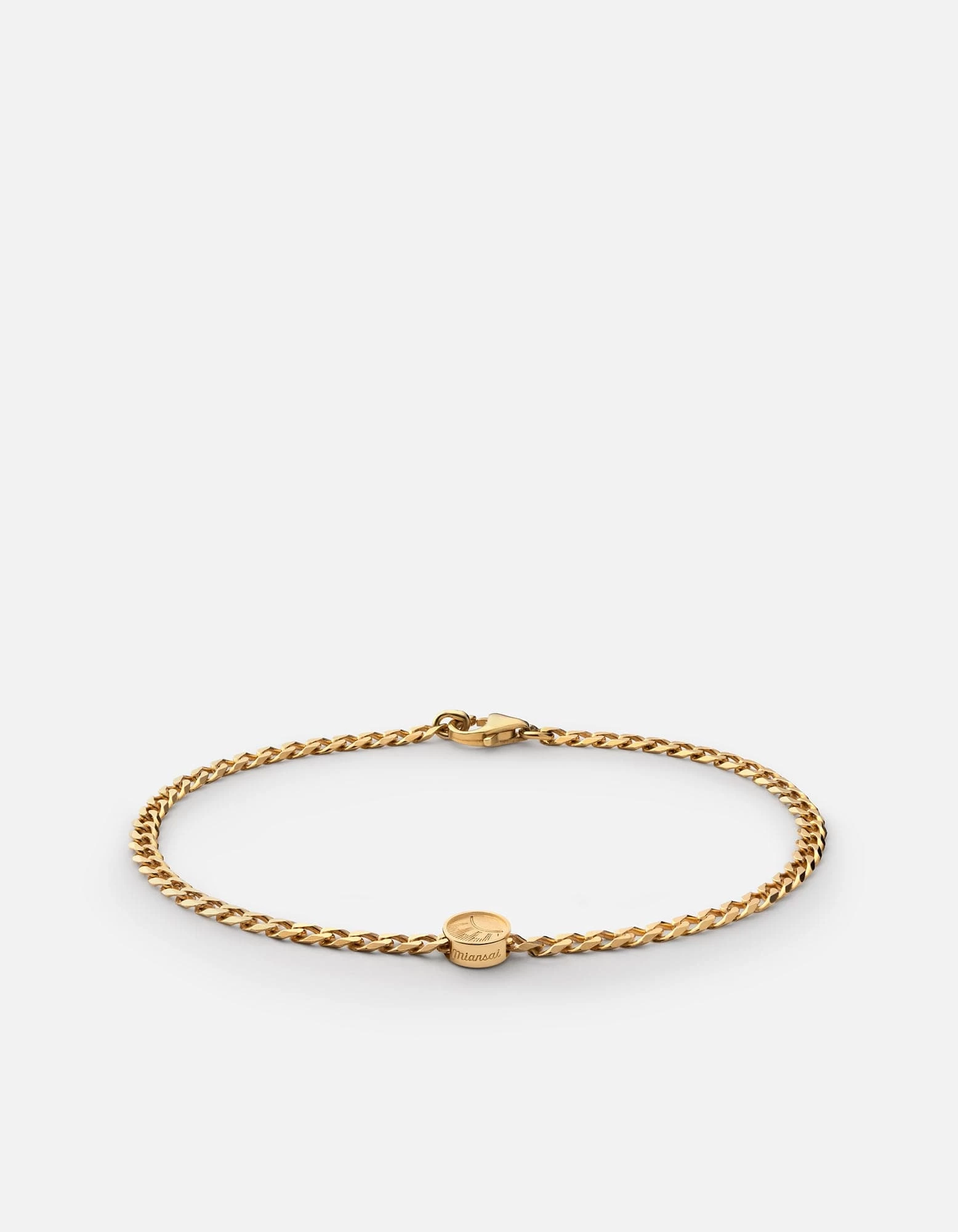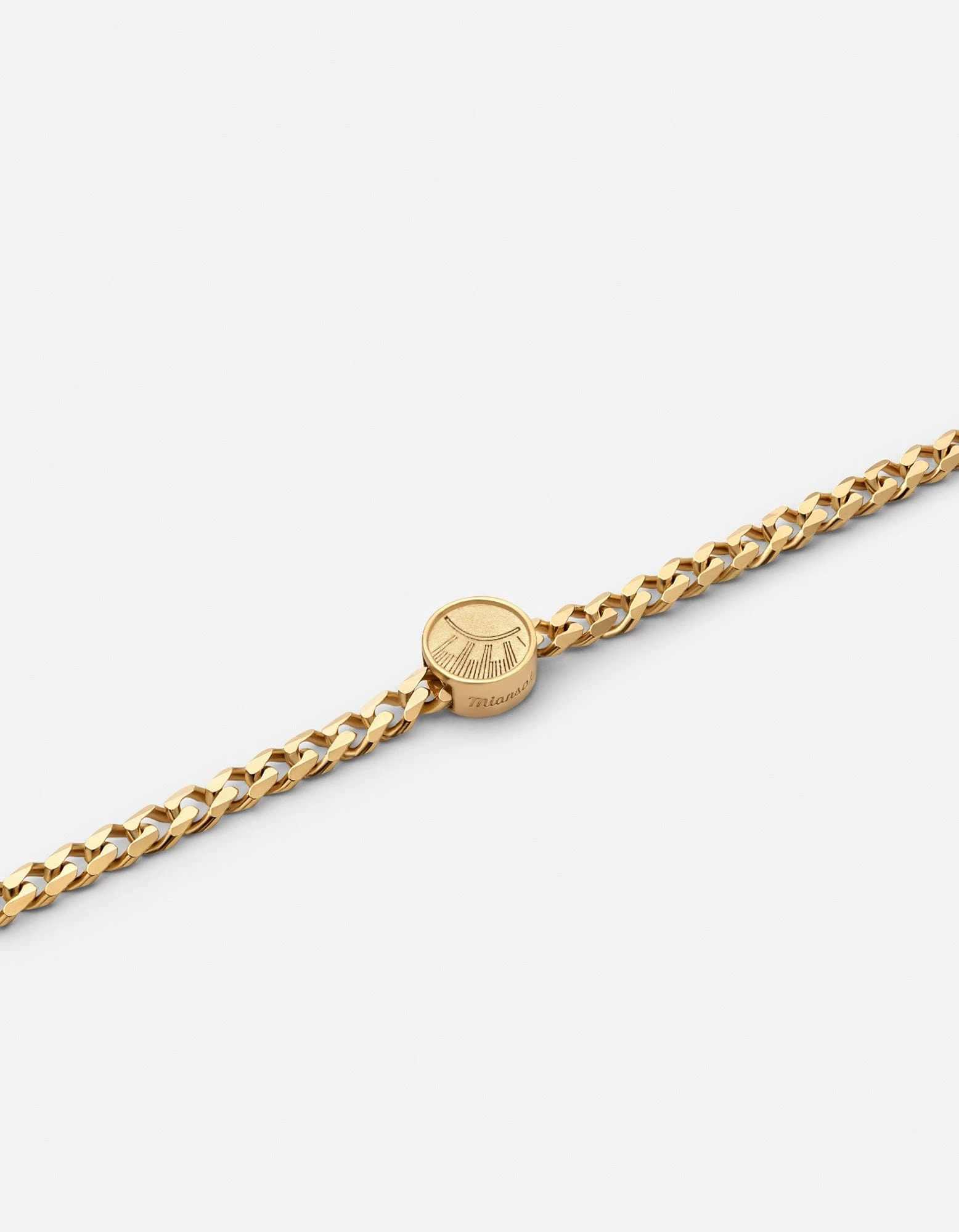 Featuring precisely drawn lines radiating from a flat, circular bead, the Meridian Chain Bracelet features a curb chain with flat edges. Made in gold vermeil. Available for men and women.