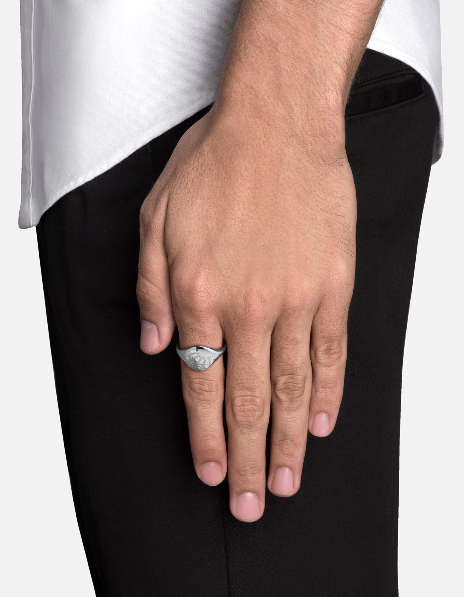 With precisely drawn lines radiating from the ring’s apex, the Meridian Ring features a stylized design on a classic signet ring. Made with sterling silver, it’s a men’s statement piece meant to spark conversation and intrigue.