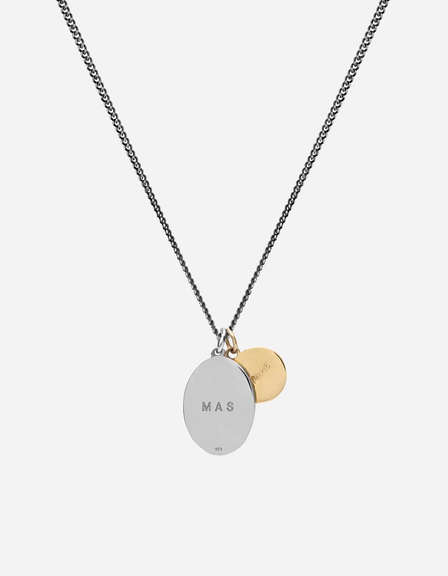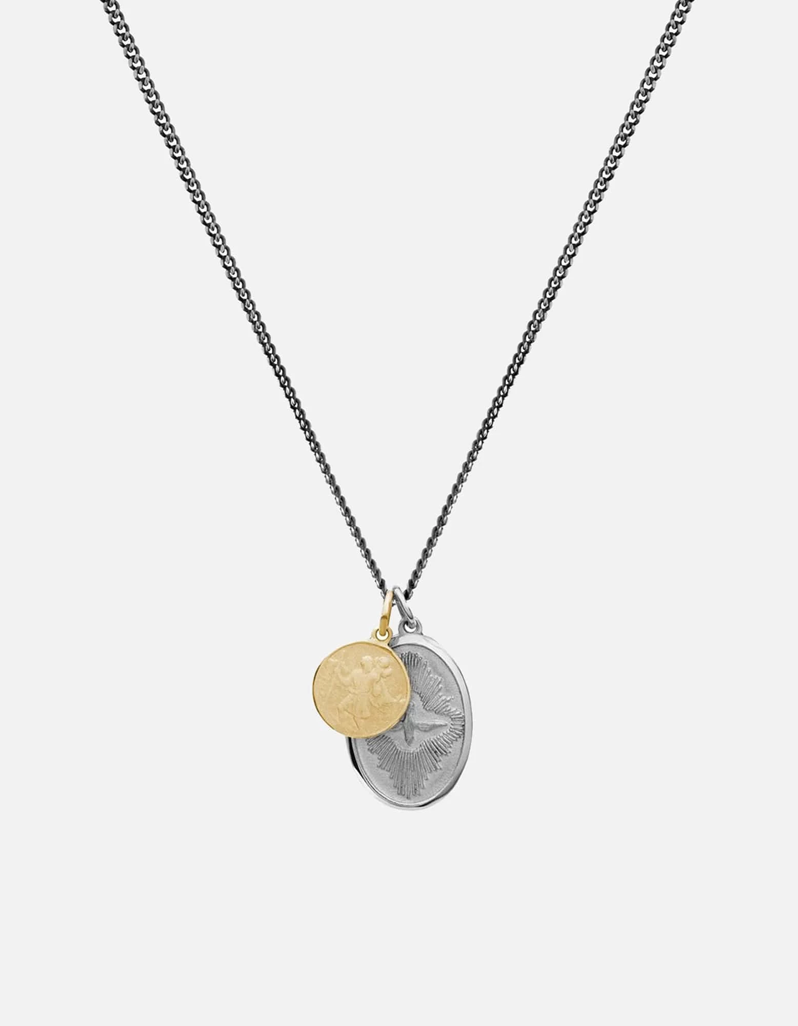 This subtle necklace for men is handmade in gold vermeil and sterling silver. Both pendants are crafted using special antique reproduction tools to allow for a unique vintage appearance. The pendant features the timeless symbol of peace and is clasped on a 24 inch sterling silver chain. It is the epitome of classic made new again.