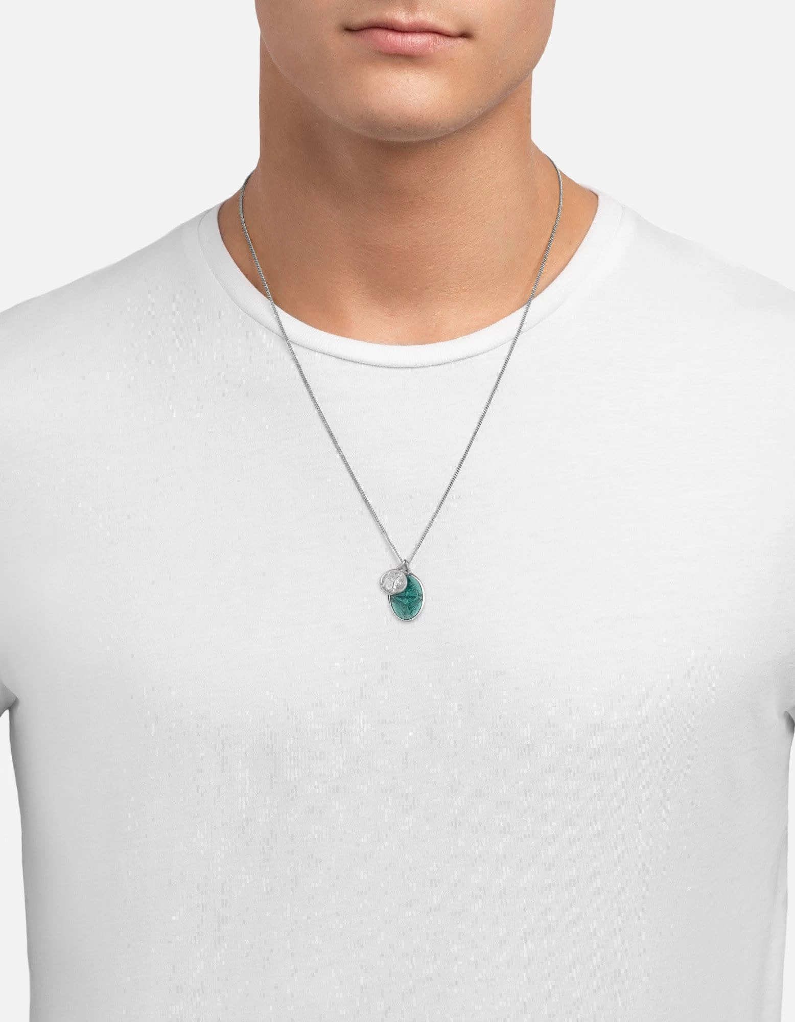 This subtle necklace for men is handmade in polished sterling silver and teal enamel. Both pendants are crafted using special antique reproduction tools to allow for a unique vintage appearance. The pendant features the timeless symbol of peace and is clasped on a 24 inch sterling silver chain. It is the epitome of classic made new again.