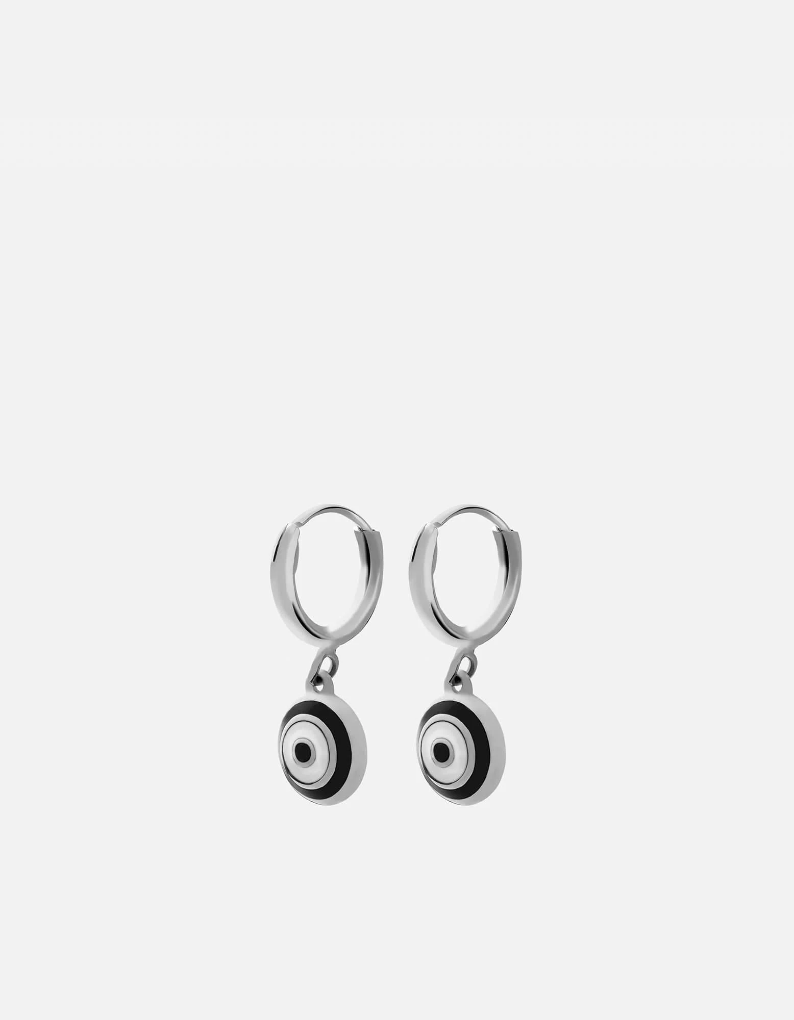Cast an eye on elevated aesthetics with the Ojos Huggie Earring, our take on the evil eye amulet that originated in ancient Greek times and is said to protect its wearer from nefarious forces. Featuring black enamel, the Ojos Earrings hang on a pair of sleek sterling silver huggies.