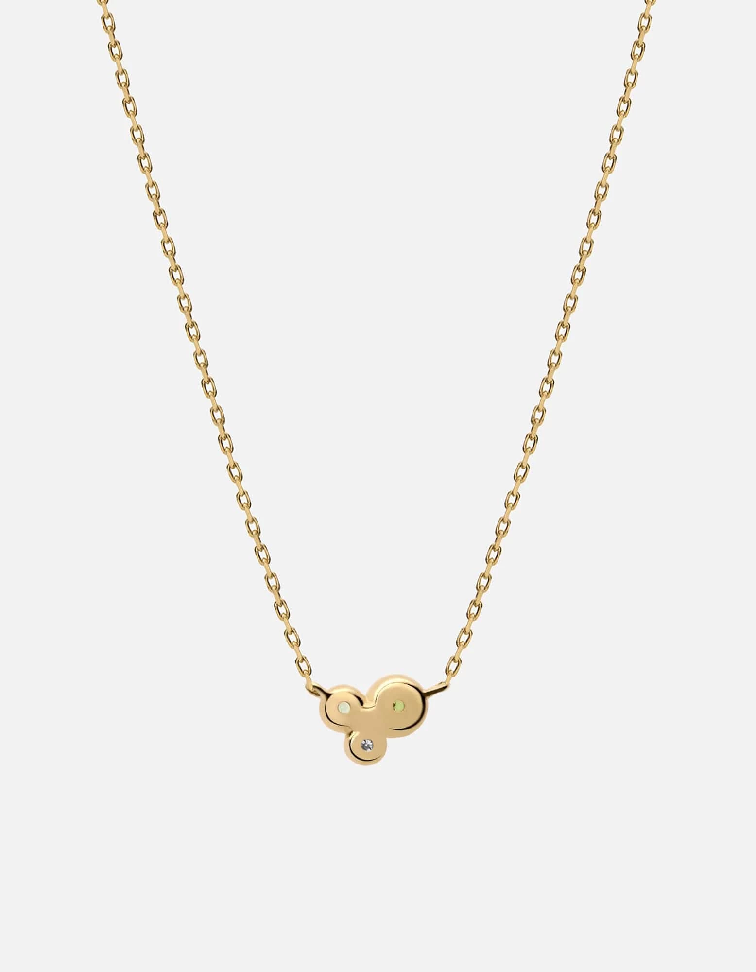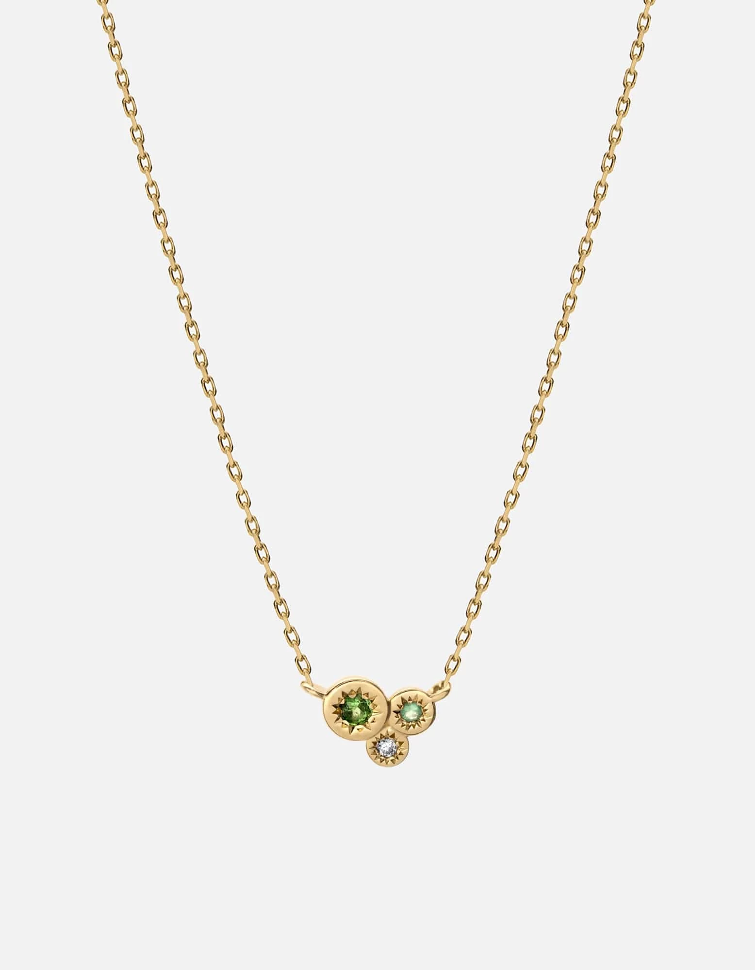 A trio of brilliance comes together in the Ora Pendant Necklace. Three 14k yellow gold discs meld together in unity on an adjustable chain. The centers of each disc are heightened with diamond and green quartz stones, and detailed engraved design inspired by the sun’s powerful beams of light.