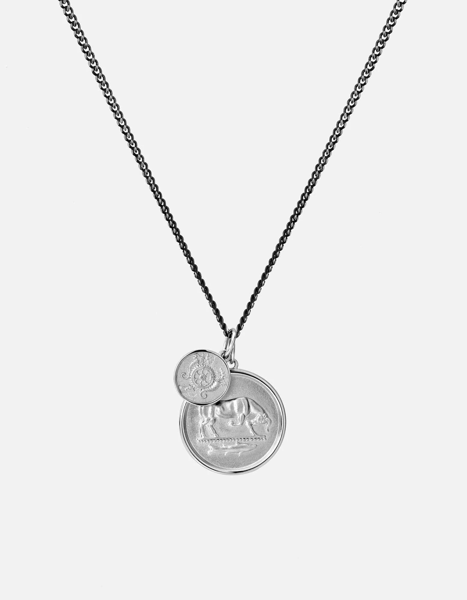 The men’s Orion Pendant Necklace was named after the constellation east of Taurus. The piece shares the message that one’s strength and faith is their fortune through the use of symbolism featuring the bull, fish and wheel of fortune. Made in polished sterling silver, hanging on a 24-inch chain.