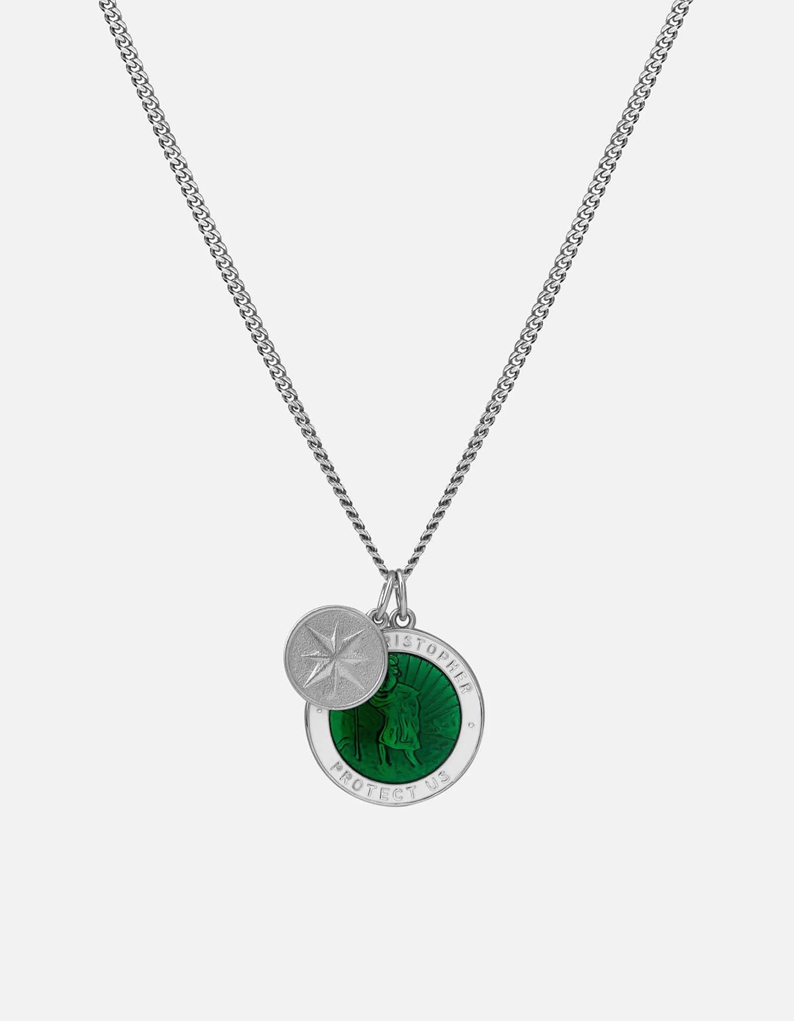 The men’s Saint Christopher Surf Necklace is our take of the popularized token for protection worn in the surfing community during the 1960s. The piece is accented with a Polaris star, representing guidance and direction. Made in sterling silver with emerald green and white enamel. Hanging on a 24-inch chain.