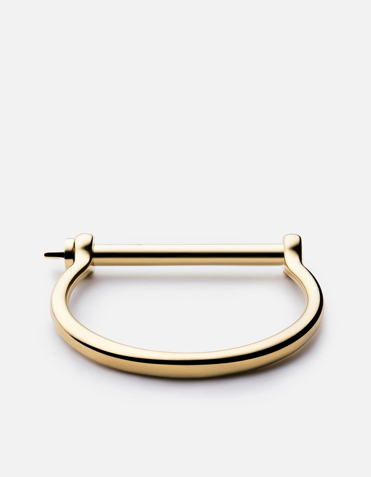 This Miansai bracelet becomes the essential timeless piece to have for every era. This iconic screw cuff is available in stainless steel with a gold finish or 14k solid gold and features a threaded bar closure at the top of the wrist. Available for men and women.