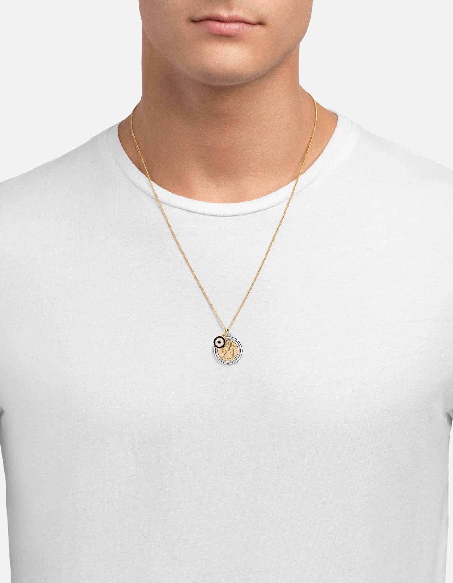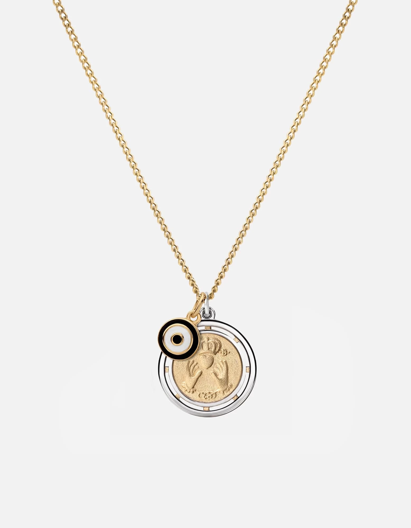 Our Test of Time Ojos Pendant Necklace features an ode to the ancient Claddagh symbol of love, loyalty and friendship. Hanging on a 24-inch chain, the pendant is accented with our Ojos charm, our take on the evil eye amulet, in black enamel.