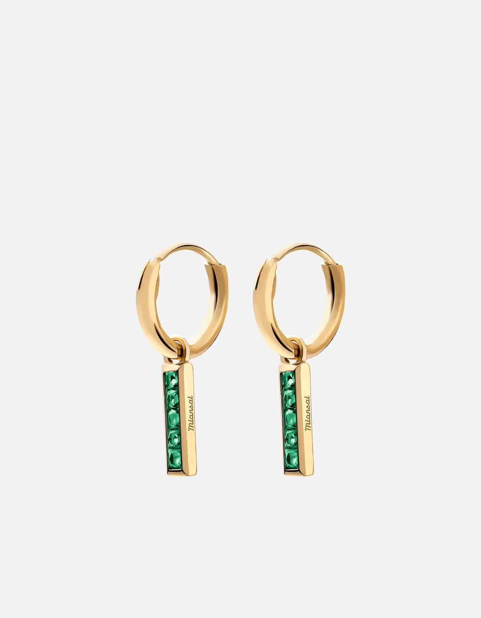 The Totem Agate Huggie Earrings features a vertically stacked four-stone charm of green agate that sways from smooth, streamlined huggies. A play between two familiar shapes, a round huggie and rectangular totem, these earrings represent the beauty of how two disparate silhouettes can come together harmoniously in one piece.